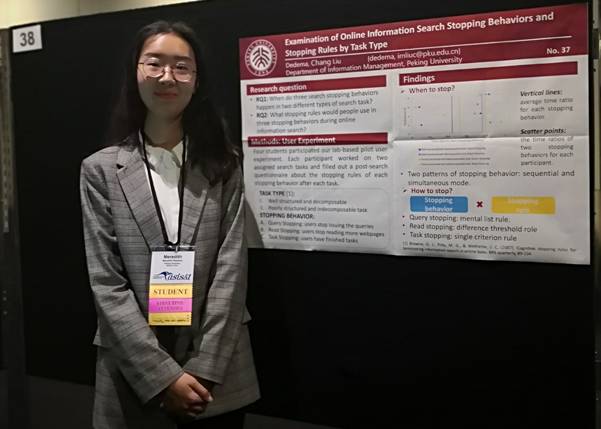 张瑶同学和刘畅老师合作完成的海报《Influence of Course Type and Assignment Features on Students' Information Seeking Behaviors》研究了现实环境中大学生为完成作业而进行的信息搜寻活动和时间管理行为,并探究了课程类型及作业特征这两类行为的影响。研究将认知与信息搜寻行为结合起来,引发了广泛关注和讨论。